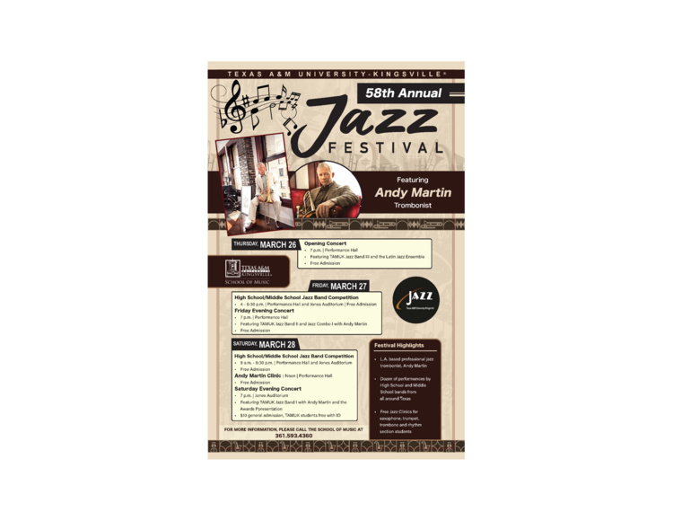 The festival is a three-day event held on March 25-27 in the the Performance Hall of the Dr. Steven H. Tallant Music Building and Jones Auditorium. The festival includes competitions, concerts and a jazz clinic featuring Andy Martin, one of the greatest jazz trombonists of the jazz world.